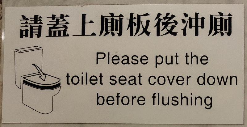 The English says, "Please put the toilet seat cover down before flushing".